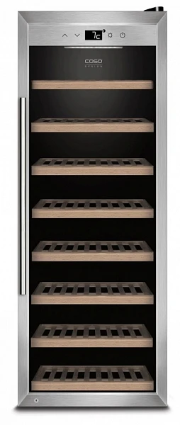Восемь съемных полок из дерева предназначены для правильного хранения вина: бутылки кладутся горизонтально (вместительность – 43 бутылки), чтобы пробки не рассыхались, и внутрь бутылки не попадал кислород. Управление осуществляется при помощи сенсорного дисплея внутри холодильника. Регулировка температурных показателей с шагом в 1°C происходит нажатием « ∧ » и «∨». Управление внутренним освещением возможно при помощи кнопки «Свет».