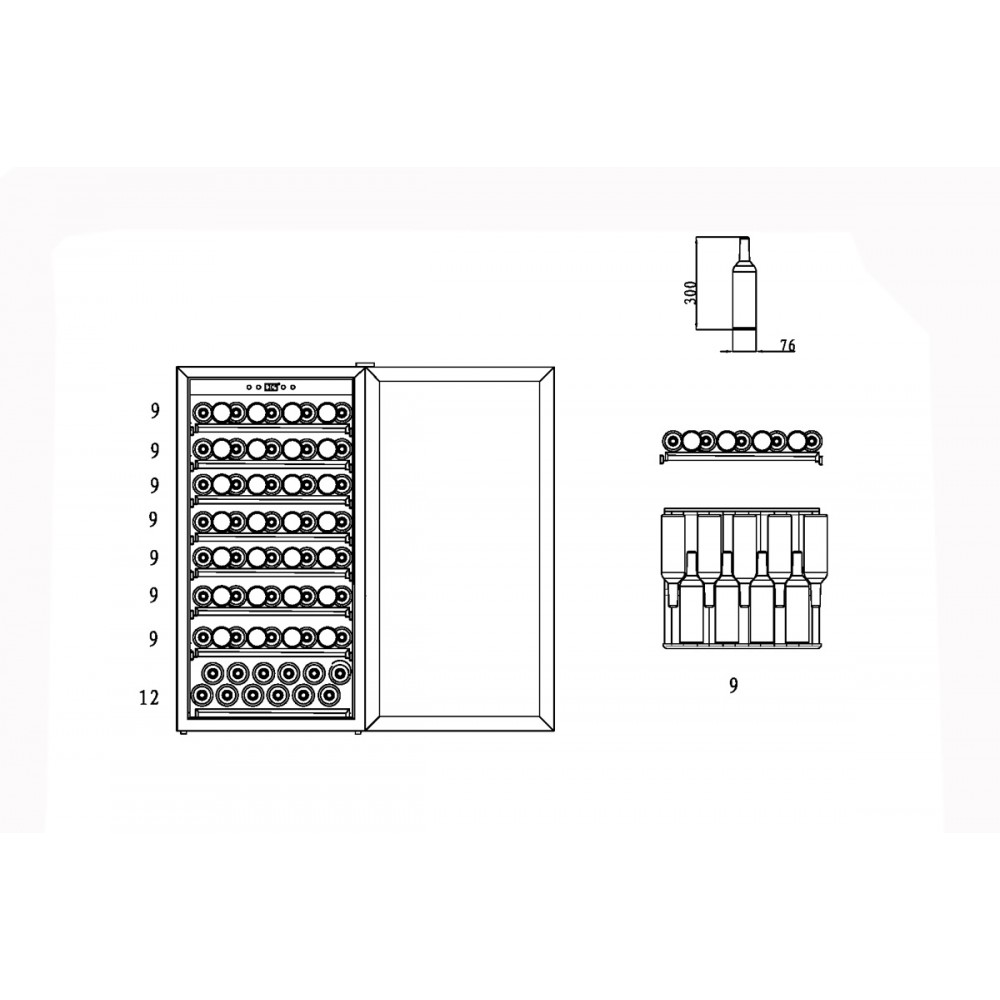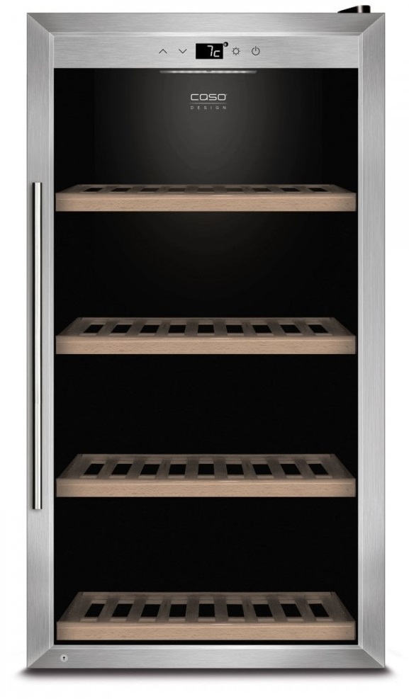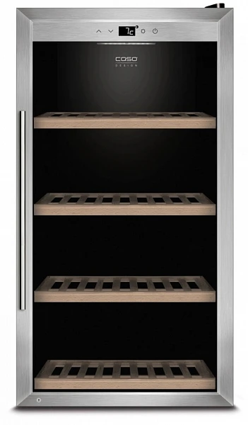Четыре съемных полки из дерева предназначены для правильного хранения вина: бутылки кладутся горизонтально (вместительность – 75 бутылок), чтобы пробки не рассыхались, и внутрь бутылки не попадал кислород. Управление осуществляется при помощи сенсорного дисплея внутри холодильной камеры. Регулировка температурных показателей с шагом в 1°C происходит нажатием « ∧ » и «∨». Управление внутренним освещением возможно при помощи кнопки «Свет».