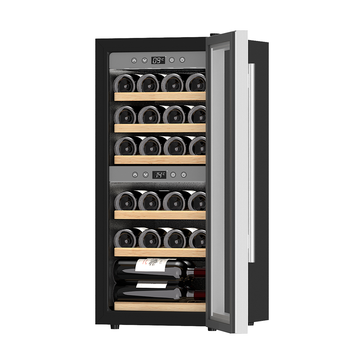Оснащен двумя температурными зонами, что позволяет отдельно хранить красные, белые или игристые вина.