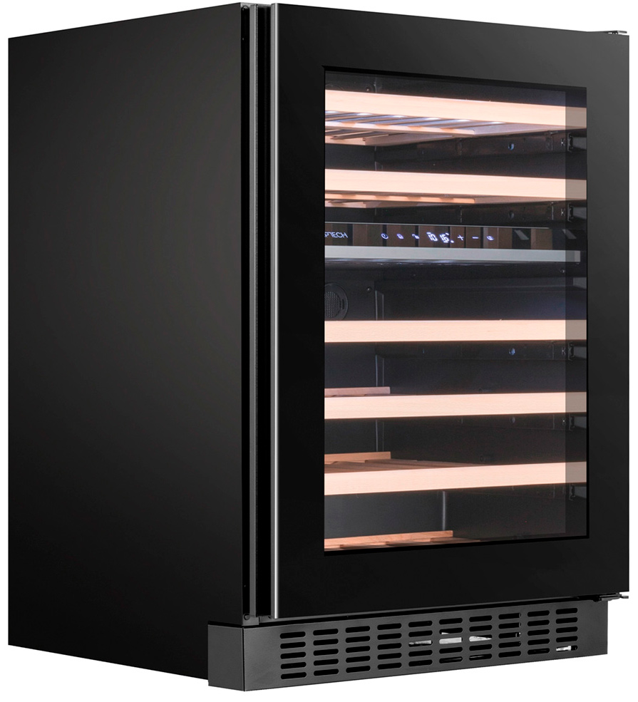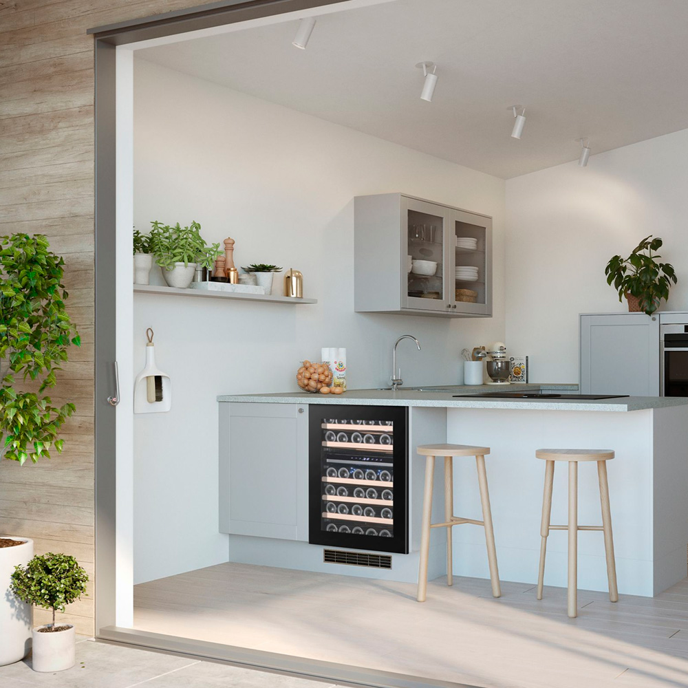 Шкаф с двумя температурными зонами (5-20 ° C, 5-20 ° C) и вместимостью 46 бутылок может быть установлен под столешницу или установлен отдельно.