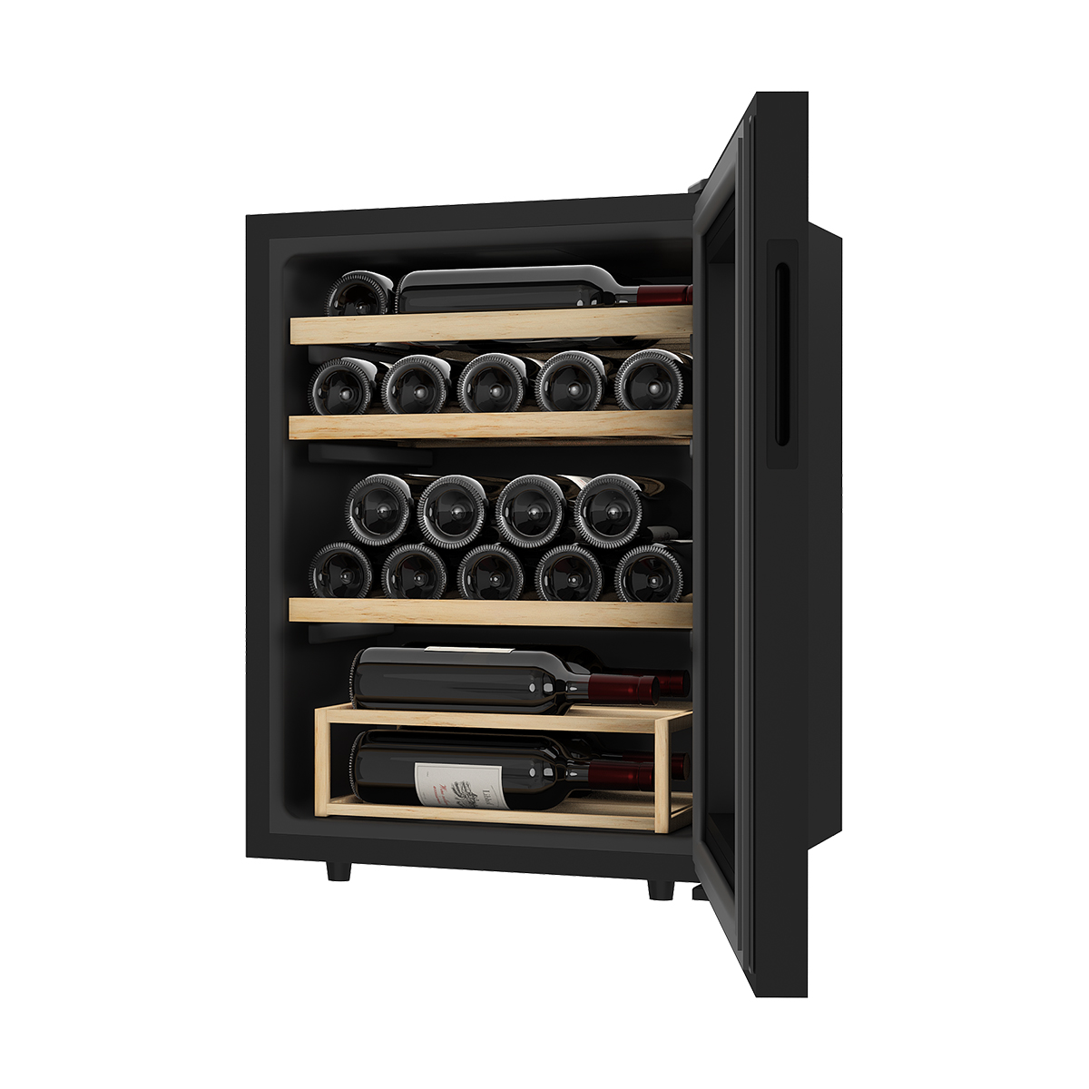 Внутреннее пространство эргономично: 22 бутылки вина удобно разместятся на 4 полках из массива бука, также некоторое количество напитка можно уложить в корзину, выполненную из того же материала, который блокирует любые вибрации.