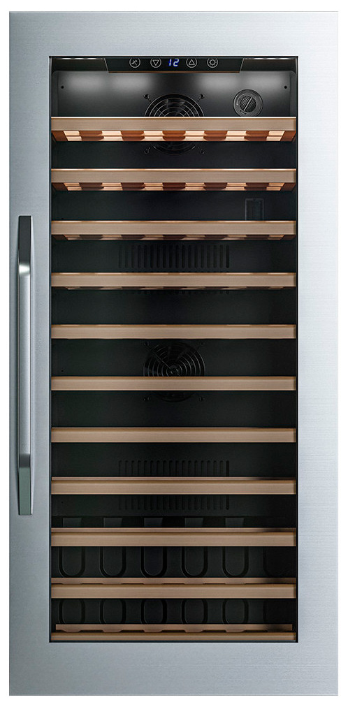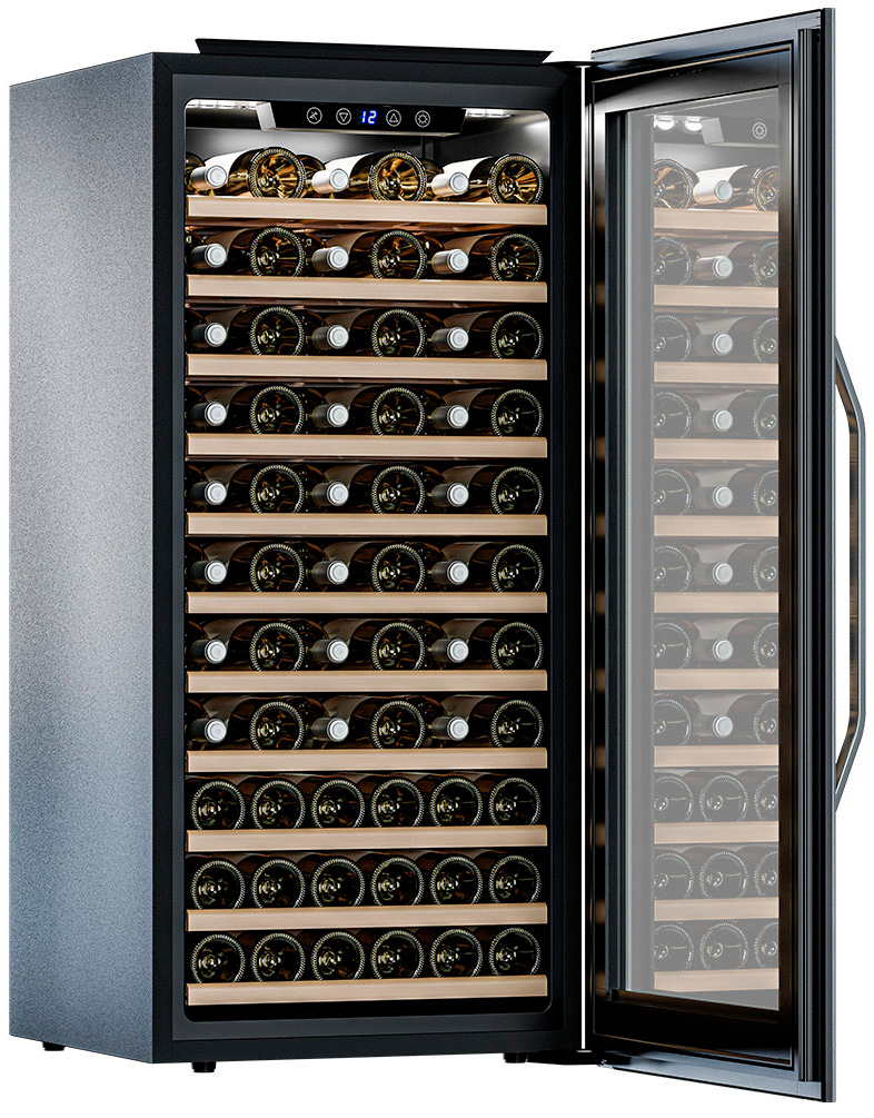 Компрессорный винный шкаф обладает большой вместимостью и способен разместить до 66 бутылок. Располагаются они на полках из массива бука. Внутреннее пространство шкафа разделено на 11 полок. Шкаф поддерживает температурный диапазон от +5°C до +18°C. Холодильник поддерживает влажность в диапазоне 60-80%, как в настоящем винном погребе.