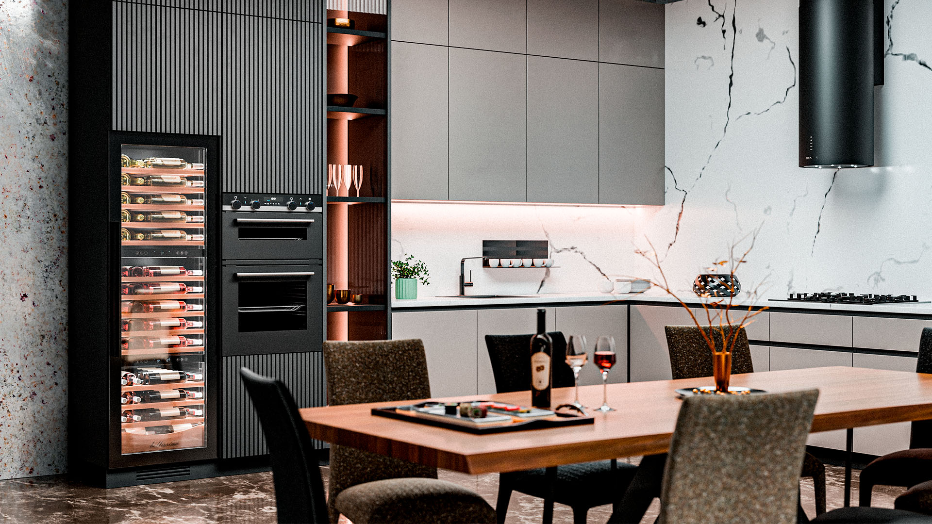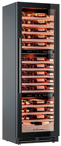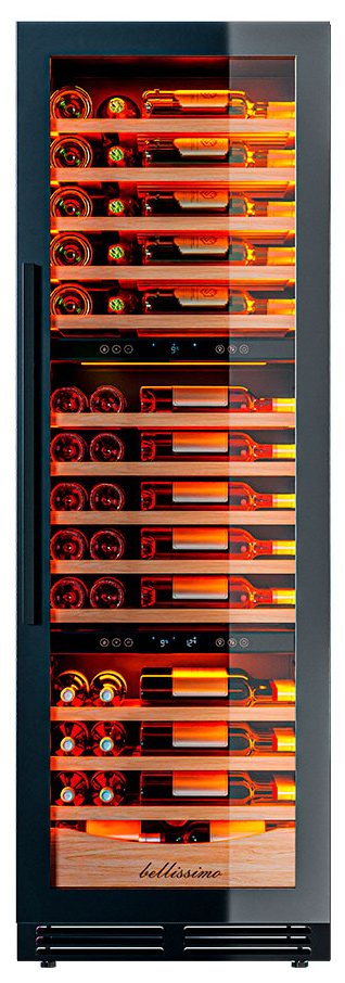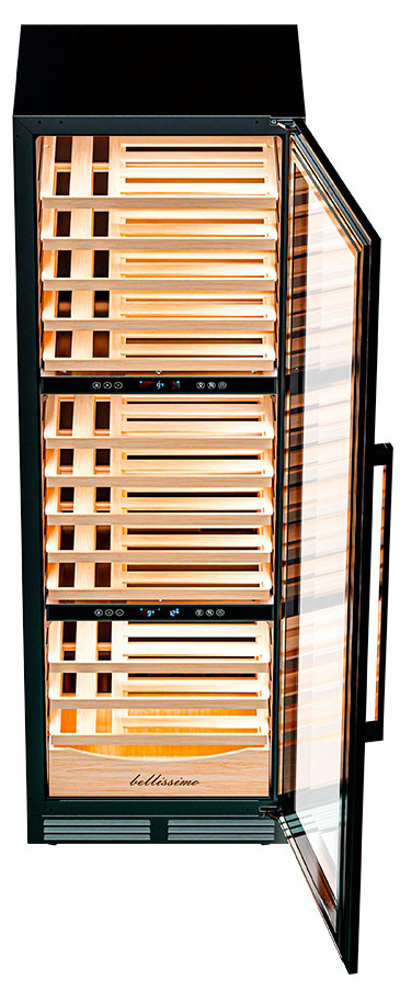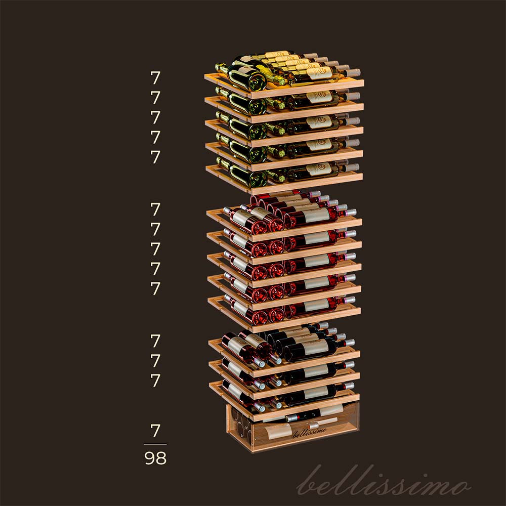 Он вмещает внушительную винотеку до 98 бутылок типа «Бордо», а если размер бутылки нестандартный, то съемные полки решат эту проблему.