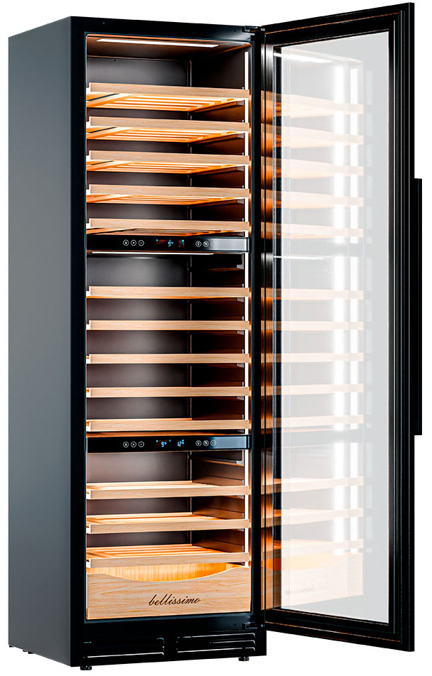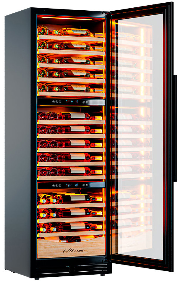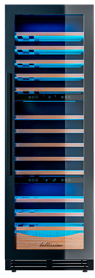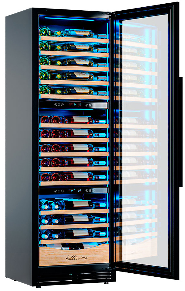 Три независимые температурные зоны для разных сортов напитков: верхняя поддерживает температуру от +5 до +20°C, средняя — от +5 до +12°C, нижняя — от +12 до +20°C. Подсветка белого, синего или янтарного цвета создает правильную атмосферу для эффектной демонстрации содержимого.