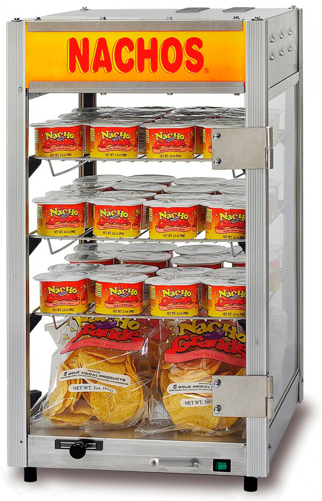 Витрина для порционных чипсов начос и соусов Gold Medal 5587EX вместимостью 60-70 банок оснащен 3 решетчатыми полками, 1 дверцей.