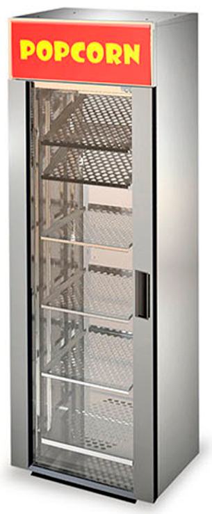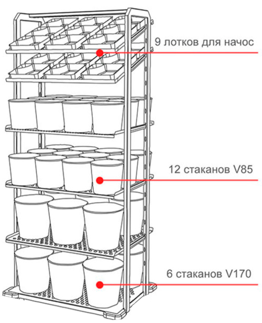 Полки можно устанавливать как горизонтально для попкорна, так и под наклоном для лотков с чипсами начос