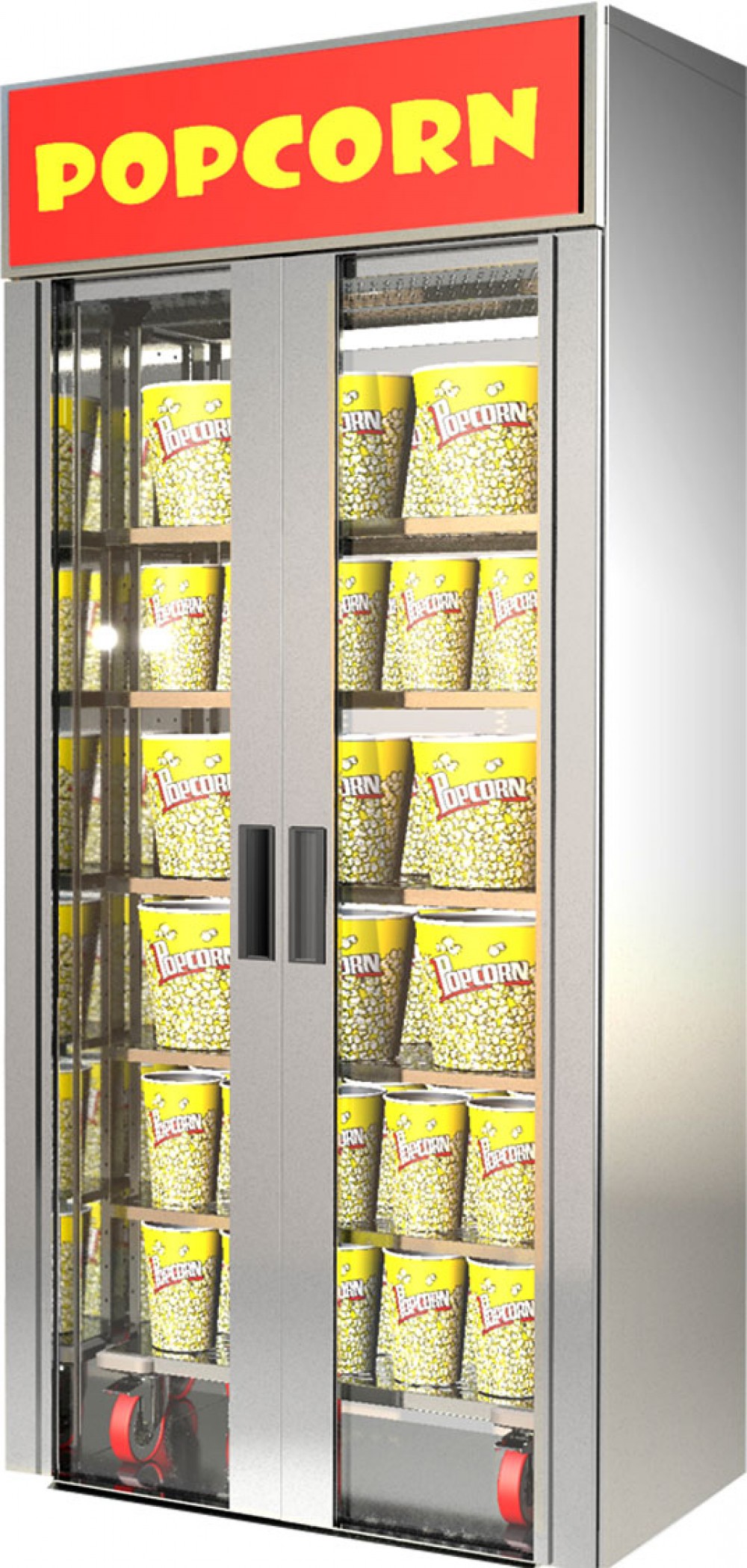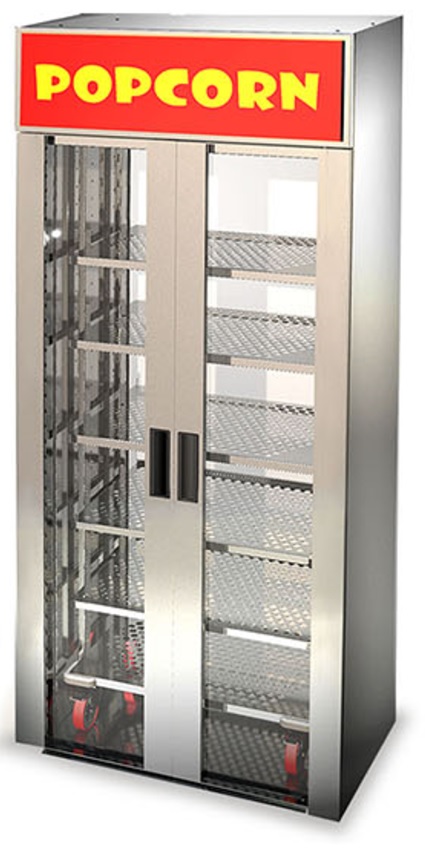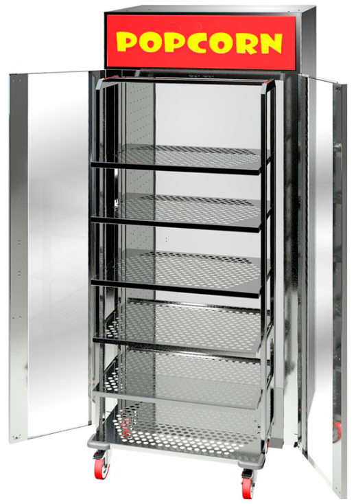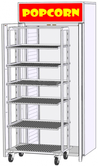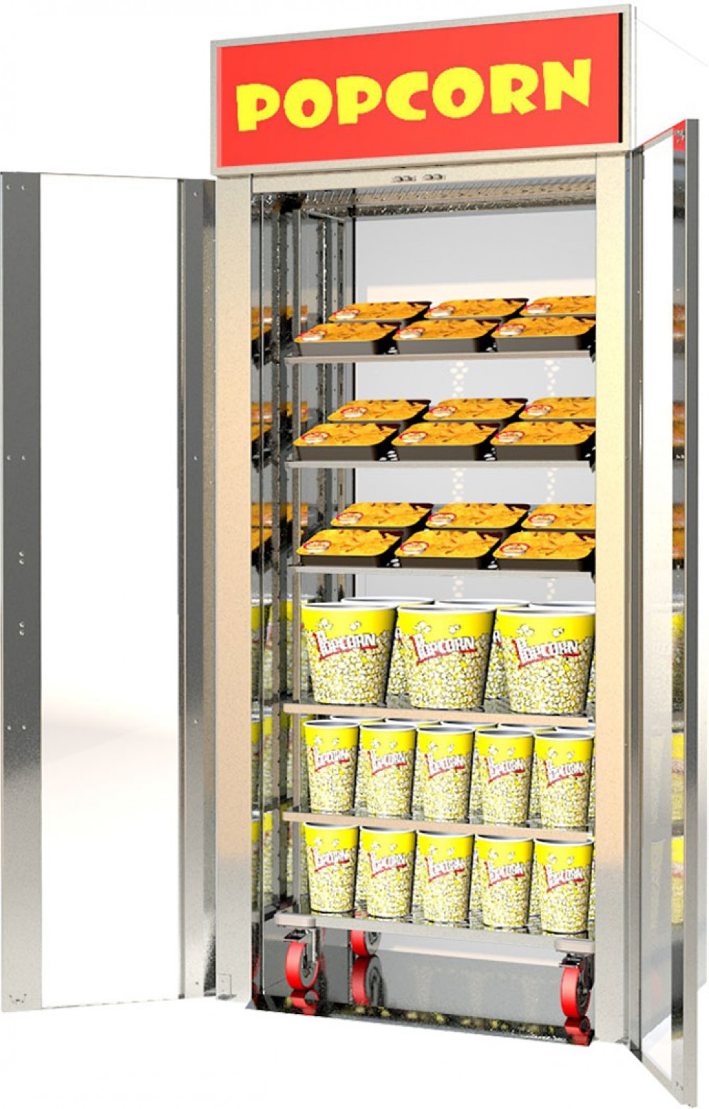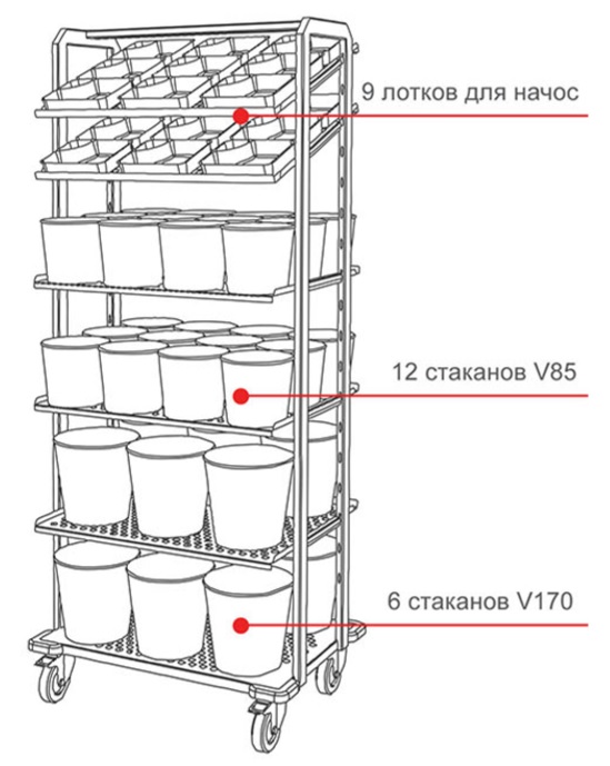 Полки можно устанавливать как горизонтально для попкорна, так и под наклоном для лотков с чипсами начос