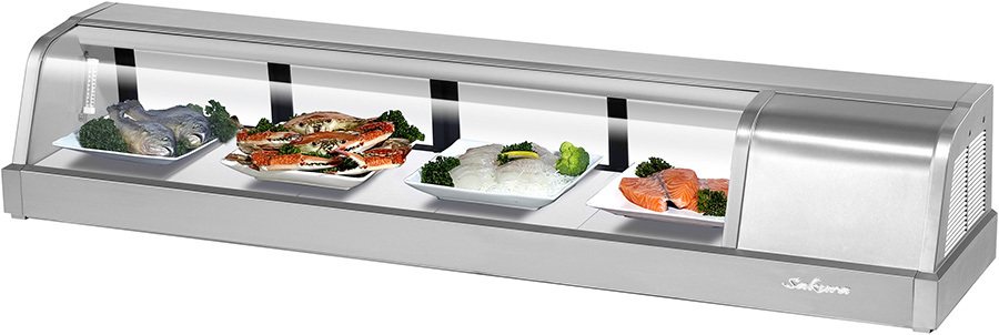 Настольная холодильная витрина Turbo Air Sakura-60-R (правое расположение агрегата) предназначена для кратковременного хранения популярных японских блюд, таких как суши, сашими, роллы и др.