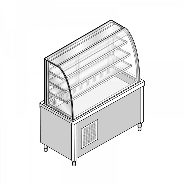 Модель имеет 3 стеклянные полки для выкладки продукции и холодильную ванну из нержавеющей стали размером 1310х510х30/80Н мм. Для удобного доступа к содержимому витрины со стороны оператора имеются двери-купе, со стороны клиента витрина закрытая.