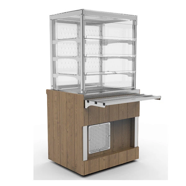 Конструкция оснащена тремя полками и боковым остекленением из закаленного стекла. Доступ персонала к внутреннему объему витрины осуществляется с помощью раздвижных дверок из двойного стеклопакета (пластик+стекло). Со стороны потребителя витрина оснащена четырьмя шторками из прозрачного пластика. Внизу со стороны персонала имеется открытый отсек для хранения чистой посуды и различного инвентаря. Опционально его можно оснастить распашными дверками или дверками-купе. Также в нише располагается розетка с защитной крышкой для подключения дополнительного оборудования.