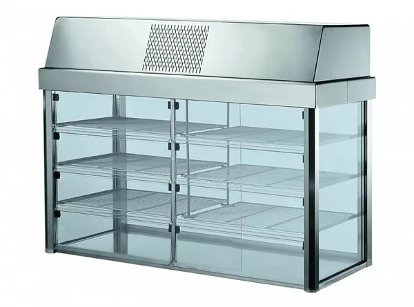 Модель имеет 3 стальные полки-решетки для выкладки продукции. Для удобного доступа к содержимому витрины со стороны клиента имеются откидные дверцы из поликарбоната, со стороны оператора - двери-купе. Витрина оснащена электронной системой управления и поддерживает оптимальную температуру хранения продуктов в диапазоне от +4 до +12°С, вмещает 3 гастроемкости формата GN 1/1, использует хладагент R404A и имеет мощность 1,2 кВт.
