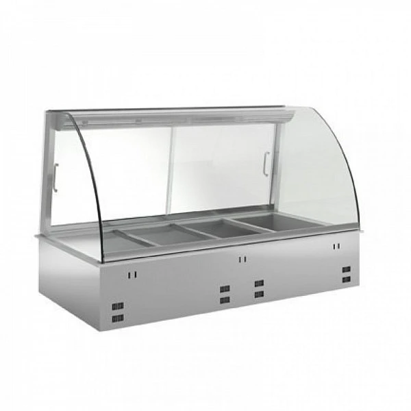 Мармит имеет одну ванну из нержавеющей стали. Данная модель рассчитана на подогрев для трех гастроемкостей формата GN 1/1. Ванна имеет отличную прочность и долговечность, а также ее очень легко чистить. Тепловая витрина I7VUVB3 обеспечивает продавцу максимальный доступ к выкладываемым продуктам. Модель представляет собой теплоизолированный короб, ограничивающий подогреваемый объем. Витрина оборудована гнутым закаленным стеклом, обеспечивающим хороший обзор и позволяющим покупателю выбрать нужный ему товар. Специальная конструкция нагревательных элементов позволяет снизить потребление электроэнергии за счет минимальной теплопотери. Также это позволяет сократить время, требуемое для достижения нужной температуры. Данная модель тепловой витрины оснащена увлажнителями, а поэтому она идеально подойдет для блюд, требующих для своего хранения влажной среды. Это позволит таким продуктам как тушеные овощи, паста и мясо, приготовленные на пару, оставаться сочными и сохранять все полезные вещества. Обогрев и подсветка данной модели осуществляется за счет галогенных ламп.