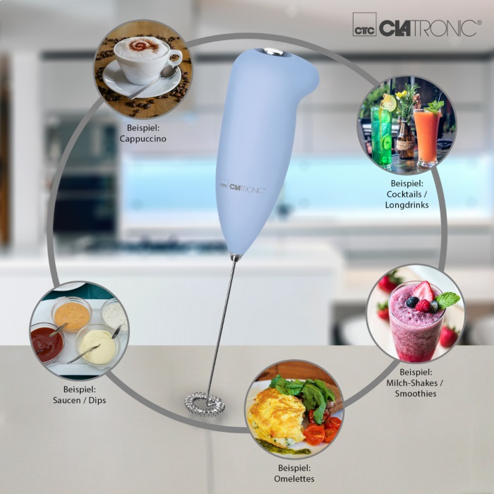 Вспениватель молока Clatronic MS 3089 blau используется для получения кремообразной молочной пены (горячая, холодная), идеально подходит для горячего шорколада, латте маккиато, фраппе и капучино.