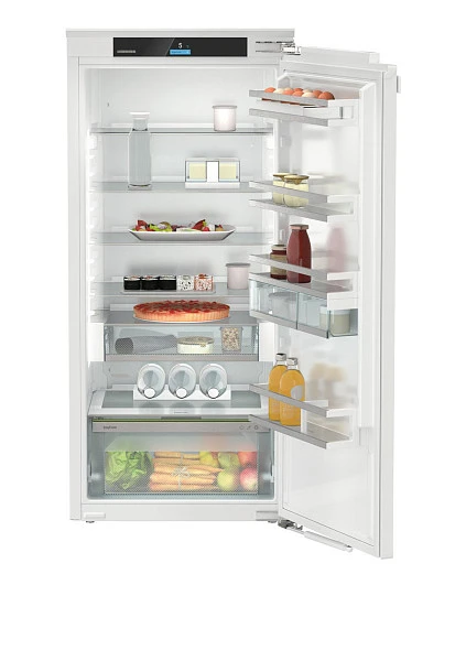 Встраиваемый холодильник Liebherr IRd 4150 с двумя ящиками: на телескопических направляющих для обычного хранения и выдвижной в зоне свежести. Помимо этого в камере регулируемые по высоте полки из крепкого стекла, которые можно переставить, если необходимо поставить большую кастрюлю или сковороду. На двери помимо стандартных полок есть два выдвижных ящика VarioBox.