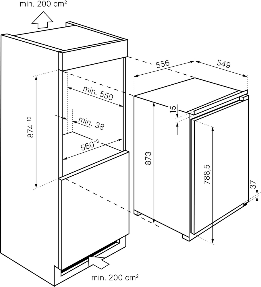 Размеры ниши для встраивания (Ш x В x Г): ≈ 560 x 880 x 550 мм