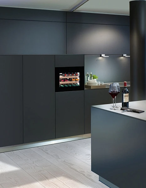 Встраиваемый винный шкаф Liebherr WKEgb 582 высотой 45 см и вместимостью 18 бутылок выделяется откидной дверцей и верхним расположением панели управления. Она отлично подойдет для встраивания в колонну на удобной высоте.