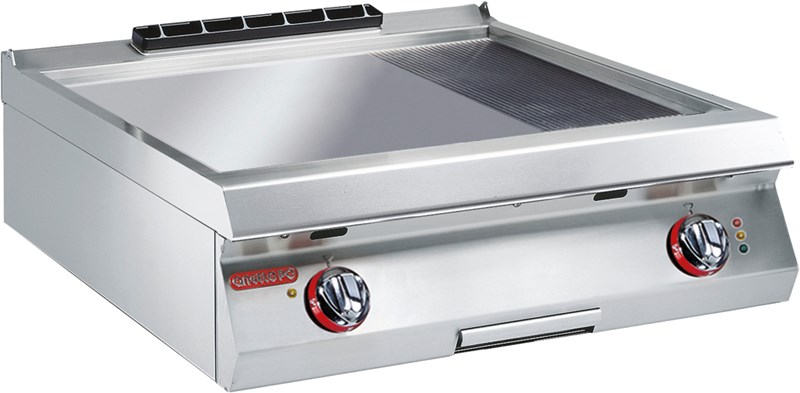 Гриль-сковорода непосредственной жарки с наполовину плоской, наполовину ребристой жарочной поверхностью размером 645*525 мм из сплава чугуна Fe510D - функциональный элемент линии Gamma.
