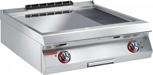 Гриль-сковорода непосредственной жарки с наполовину плоской, наполовину ребристой хромированном жарочной поверхностью размером 645*525 мм - функциональный элемент линии Gamma.