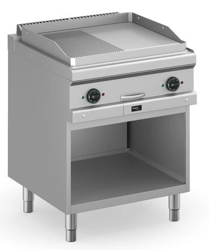 Модель с закругленными краями и бортами оснащена электромеханической панелью управления с 2 терморегуляторами и 4 световыми индикаторами, выдвижным лотком для сбора остатков пищи, масла и жира и открытой подставкой с регулируемыми по высоте ножками.