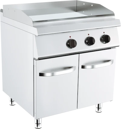 Гриль-сковорода электрическая напольная, на закрытом стенде с 2 распашными дверями, оснащена гладкой стальной (ST 52) поверхностью с 2 зонами нагрева, бортиком с 3-х сторон толщиной 3мм, вместительным жиросборником.
