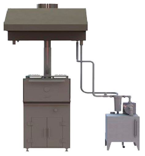 Оснащен фильтром жиро уловителем фильтром, 2-й водяной завесой, фильтром саже и дегте уловителем, гидроблоком для автономной работы от централизованной системы водоснабжения.